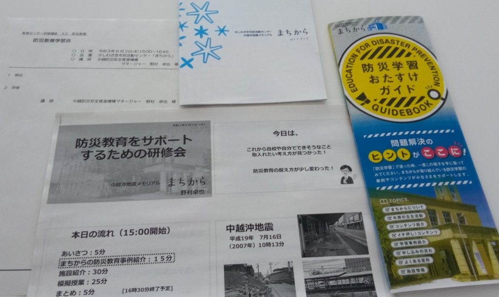 今年度も柏崎市教育センター研修の講座にいくつか参加させてもらっています。ここでも紹介したように前回は5月17日の「人権教育、同和教育」の研修でした。今日は「防災教育学習会」でした。会場は「まちから」でした。まちからの施設見学を含め、学校での防災教育をどう行っていくのか、について説明してもらえました。