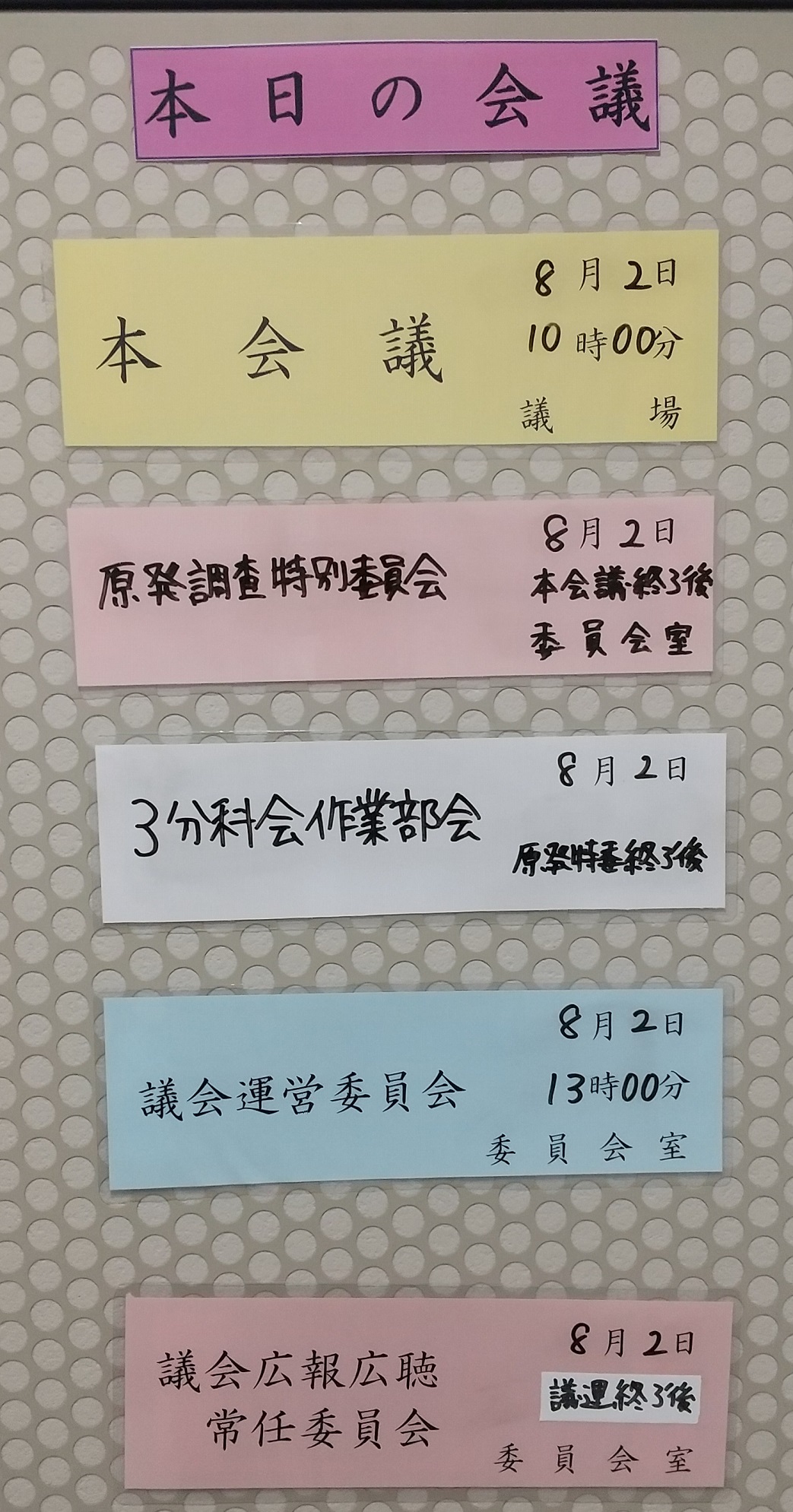 今日は随時会議をはじめ、いくつかの会議がありました。随時会議→会派代表者会議→予算決算分科会→議会運営委員会→広報広聴常任委員会と続き、その間にも打ち合わせを重ねることになりました。