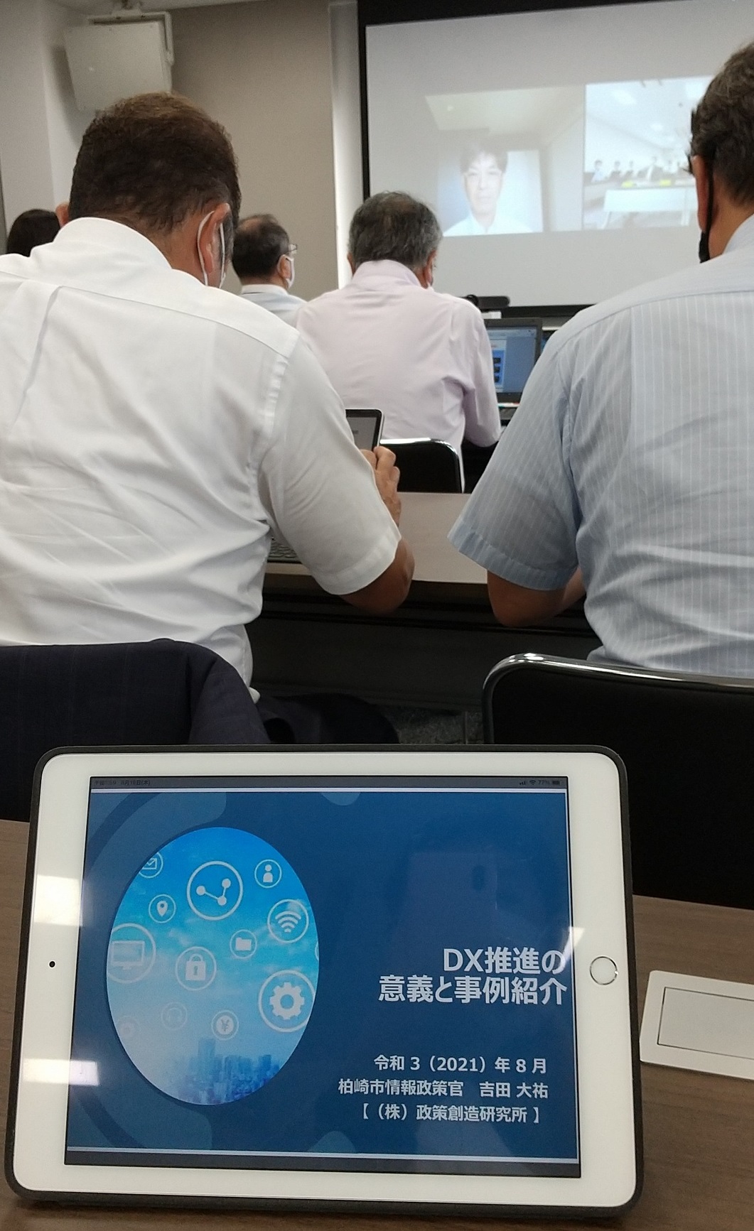 午後からは議員研修会としてDXについての研修を行いました。講師は柏崎市情報政策官の吉田大祐様です。今回はコロナ禍ということもあり、東京にいる講師とはリモートでつながり、講習を受けました。