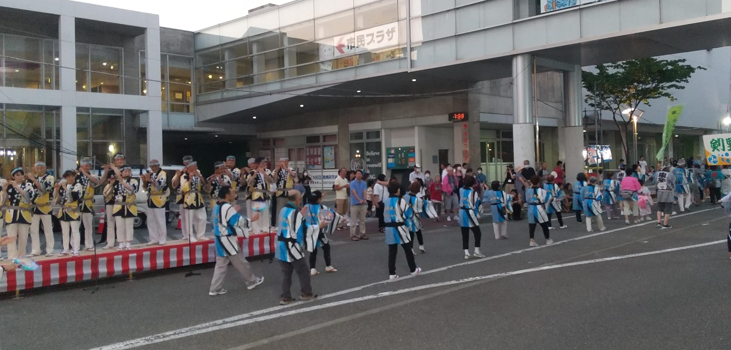 今回私は副議長という立場ですので、柏崎商工会議所前の本部関前に立って、参加者の様子を見ることになりました。商工会議所の正副会頭、正副市長、そして正副議長がその場にいたのですが、初めてでしたので、少し落ち着かない感じでした。でも、会頭をはじめ皆さんはさすが組織のトップですからこんな私でも温かく受け入れてくださいました。それはそうと、今日の参加団体、参加者はコロナ禍前に比べ7割くらいになっていたとのことです。3年間のブランクは、このようなイベントへの参加意欲も削いだのかもしれません。その中でも、参加した皆さんは生き生きした表情で、楽しそうに踊っていました。