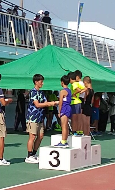 さて、今年はこの陸上競技場ができて100周年の記念の年です。8月26日(土)にはその記念式典が行われます。そのような記念の年ということもあり、今日は東京オリンピックのマラソンに出場した十日町市出身の服部勇馬選手がゲストとしてきてくださいました。実際に子どもたちと一緒に走るということではありませんでしたが、長距離レースのときに、自らマイクを持って選手を励ましながら応援をしていました。また、表彰の授与者としても手伝ってくれました。優勝者には服部選手のサインも渡されていました。そして大会の後は、子どもたちにクリニックとして走り方や練習の仕方などを指導してくださいました。