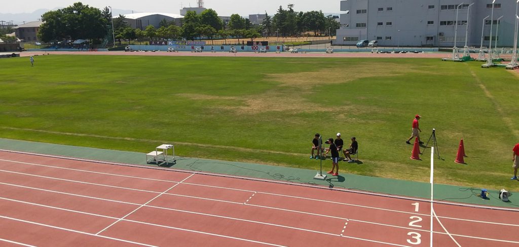 毎日身体に応える暑さが続いています。その中、今日は陸上競技場で「今井杯」が行われました。小中学生による大会です。中学生は1・2年生による新チームになって初めての公式の大会で、毎年この時期に行われています。私は、陸上競技協会のメンバーとして写真判定の役員をしていました。