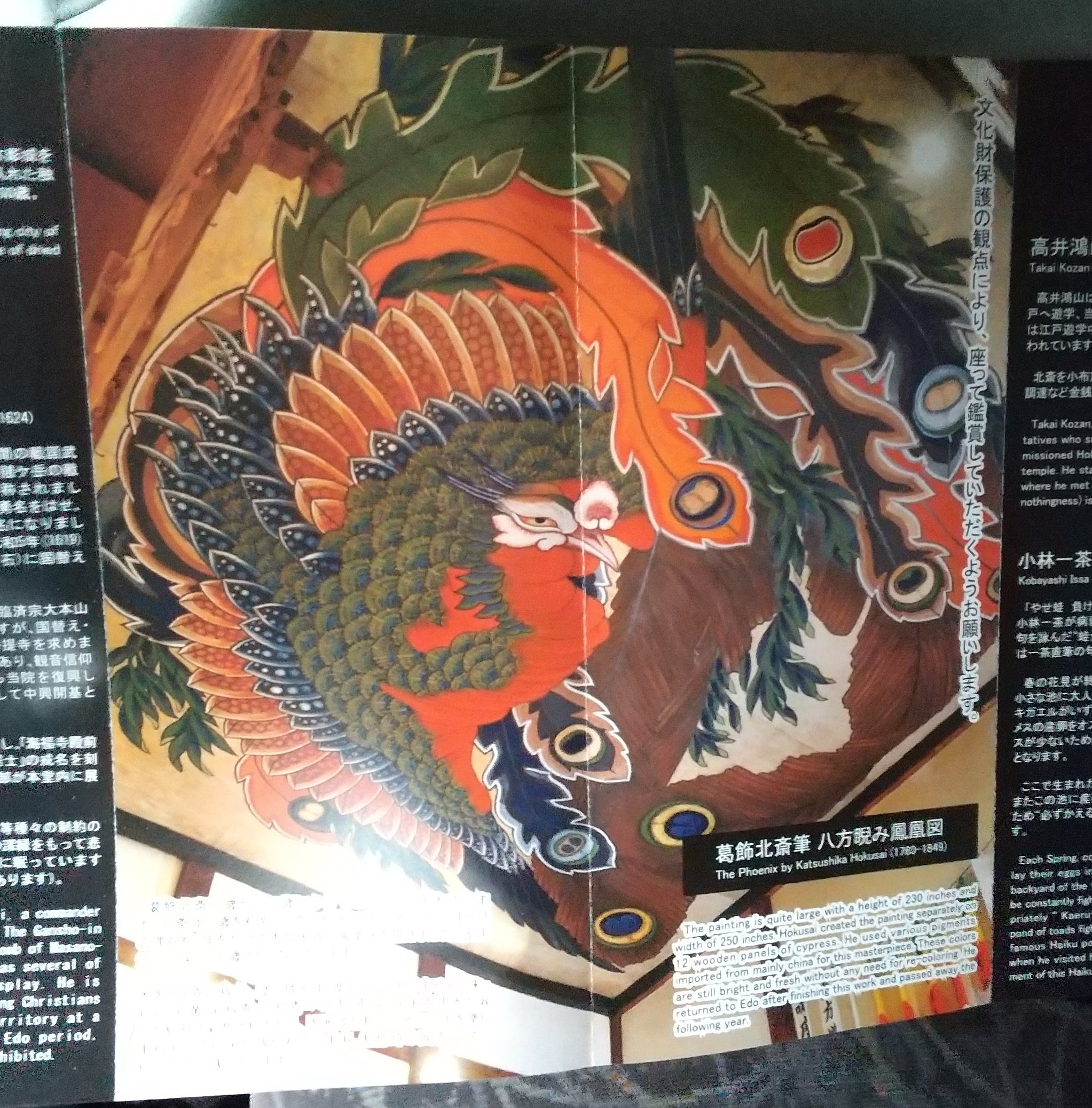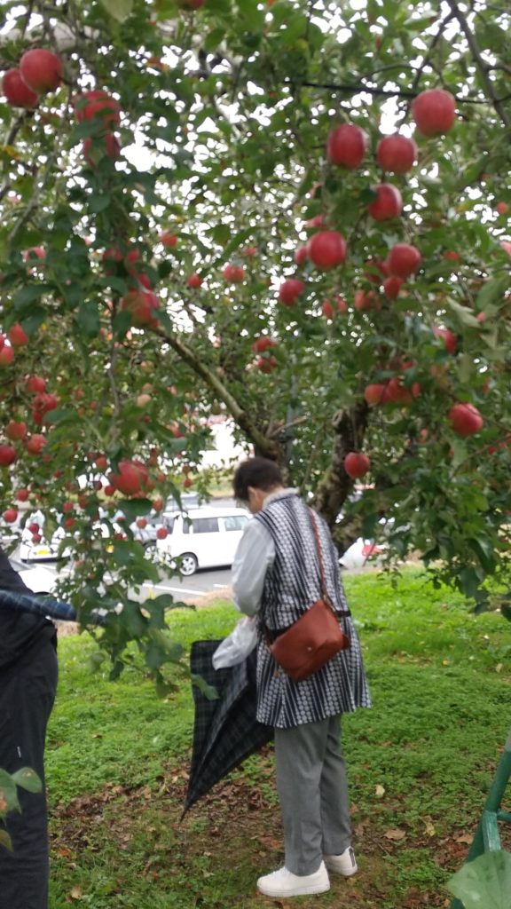 内容としては、リンゴ狩り、岩松院での北斎の八方睨み鳳凰図の鑑賞、バラ園鑑賞、道の駅でのお土産など豊富なものでした。実は私、リンゴ狩りをするのは初めてでした。もともとリンゴを食べられないということもあったのですが、木になっているリンゴはおいしそうに見えました。そして岩松院。葛飾北斎はここ小布施を愛し、しばらくは住んで、数多くの作品を残しました。そのうちの一つが八方睨み鳳凰図です。天井に設置してあるのですが、どこから見ても鳳凰と目が合うように描かれています。それだけでも訪れる価値はあるのですが、それ以外に、小林一茶の「やせがえる・・・」の句を詠んだ場所としても有名ですし、福島正則の「槍」や「黒田節」としても有名なところです。