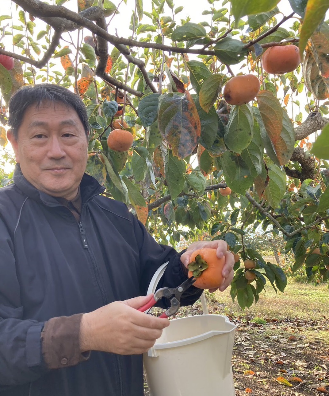 実は柿の収穫を本格的にやるのは初めてでした。昔は高い柿の木に登って、ただ無理やりもぎ取っていたような思い出はあります。新道の柿団地ではそれほど高い木にしておらず、手を伸ばして枝についている柿をはさみを使って切り取ります。