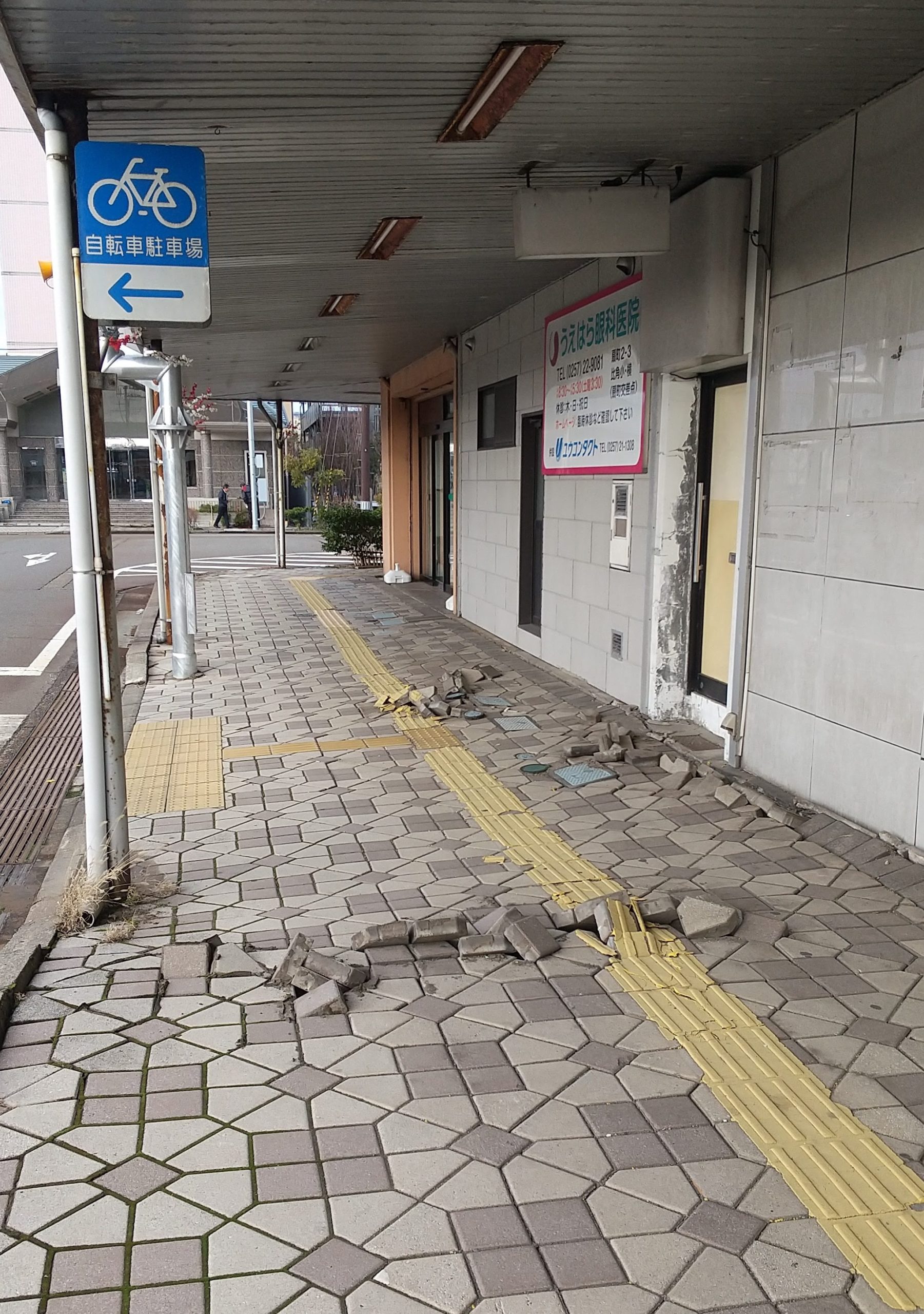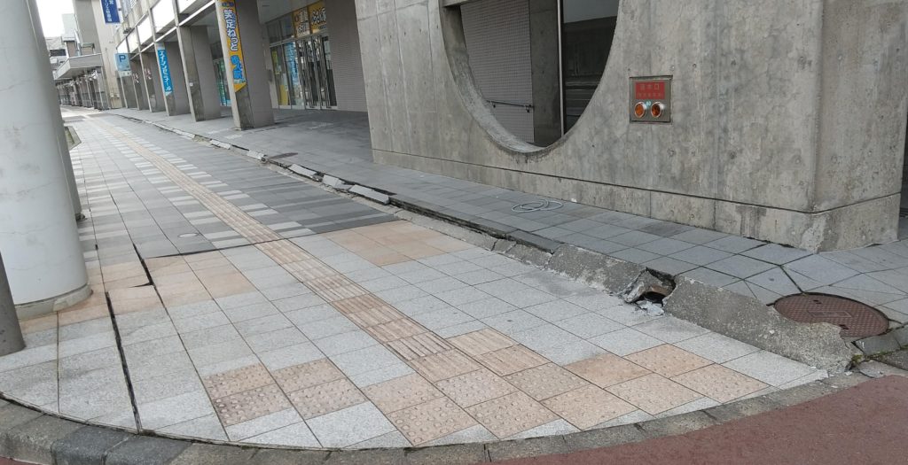 市街地を車で見て回りました。建物自体では駅前のホテルのレストラン入り口のガラスが割れていましたが、その他大きな損傷が外見からは分かりませんでした。ただ、道路というか歩道の損傷が大きいようでした。特に市民プラザ前から駅前までの区域に被害が多くみられました。歩道のタイルがめくれていたり、建物との間が割れていたり、どれもそのままにはしておけない状況だと思います。