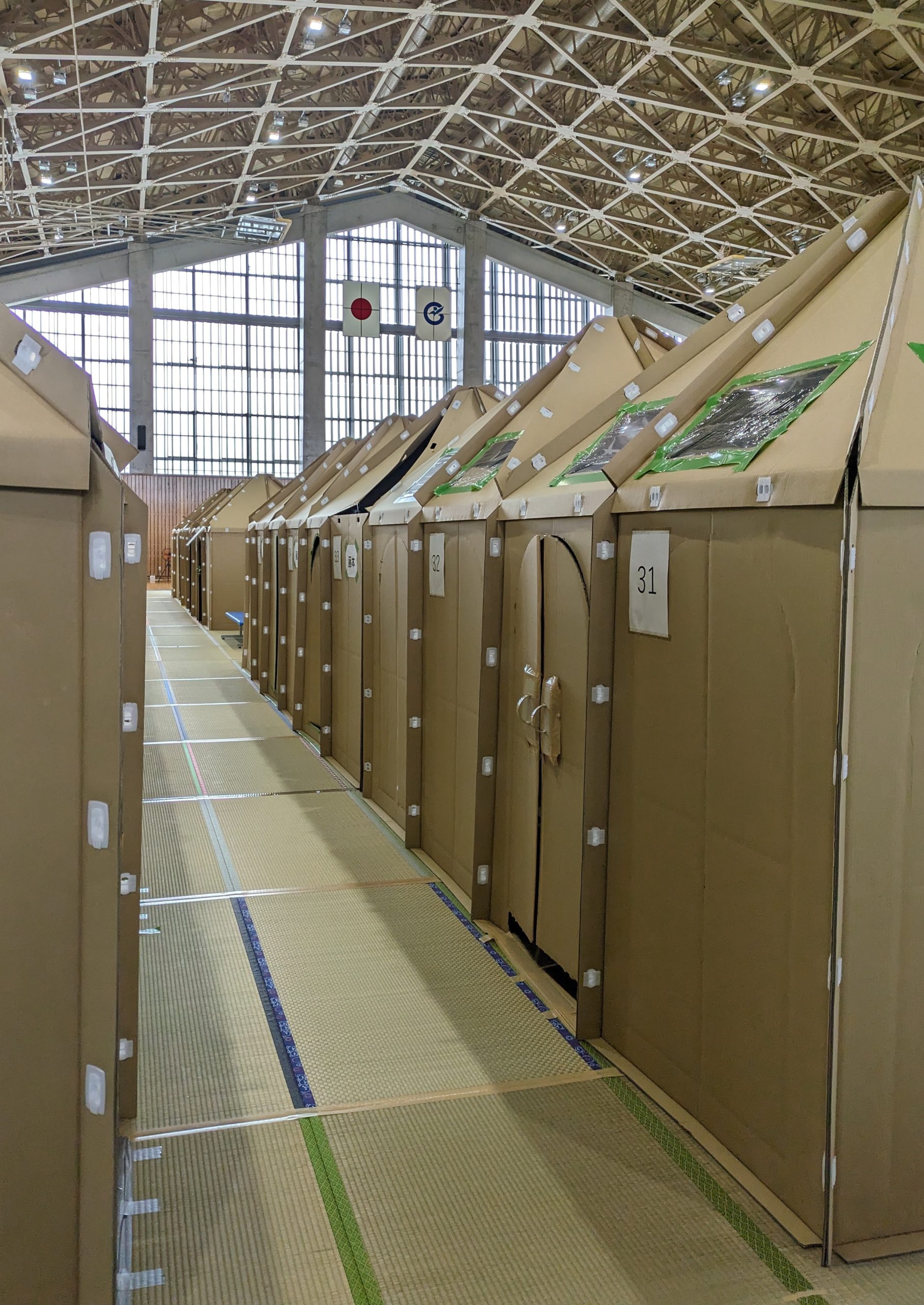 避難所は七尾市では現在5か所開設しているとのことでした。その中の1か所を視察させていただきました。市民体育館でした。見た状況ですが、段ボールで屋根付きの部屋を組み立てたプライベート空間を作っていました。この部屋は一人用で、中には段ボールベッドが入っているとのことです。また、床には畳組合から寄付していただいた畳が1500枚引いてありました。床から30㎝高いところで寝ることにより感染症を防ぐとこができるということもあり、畳や段ボールベッドにより感染症やひいては災害関連死が防げることはありがたいことです。今では水道も通っているので、トイレも通常に活用できていました。ここの避難所は、市の職員が管理しており、市からのお知らせも掲示してありました。