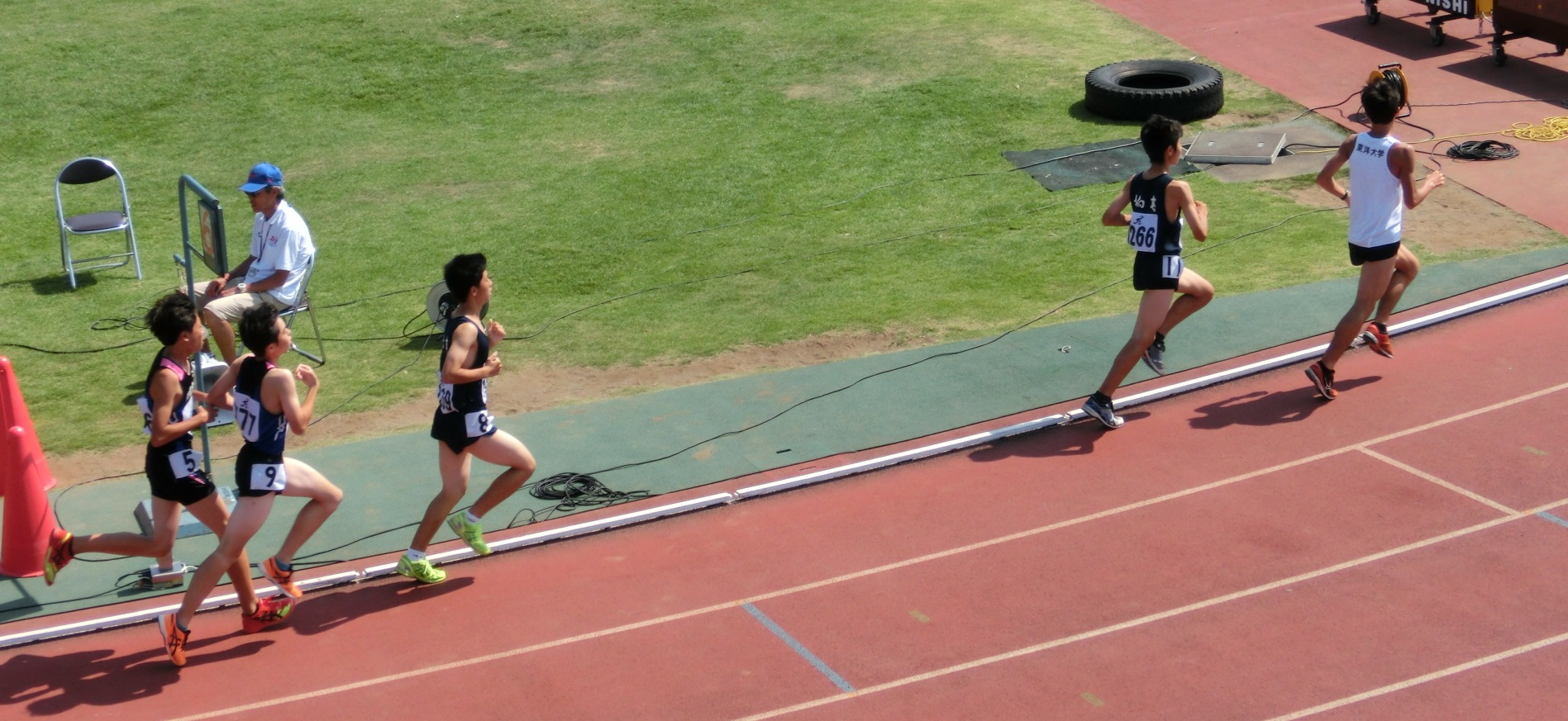 今日は標記の陸上大会が行われました。市内の小中学生(一部に高校生)が参加しました。暑い中でしたが風の具合もよくいくつかの大会新記録が出ました。特に小学生のレベルが高くなってきていることに嬉しさを感じるとともに、その指導者へ敬意を表したいと思います。そんな中、今日は東洋大学陸上部の酒井監督と長距離選手3名が大会に来られていました。長距離種目には小中高校生と一緒に大学の選手も走ってくれていました(下の写真の先頭の白いユニフォームの選手が東洋大学の選手です)。この大学の選手は3000mを9分30秒くらいのペースで楽々と伴走しているのです。彼らにしてみると当然のことなのでしょうが、やっぱり、さすが箱根駅伝で区間賞を狙える選手は違うなあと思ってしまいます。憧れの選手を生で見て、一緒に走れるなんて素晴らしいことです。今から正月の箱根駅伝が楽しみです。