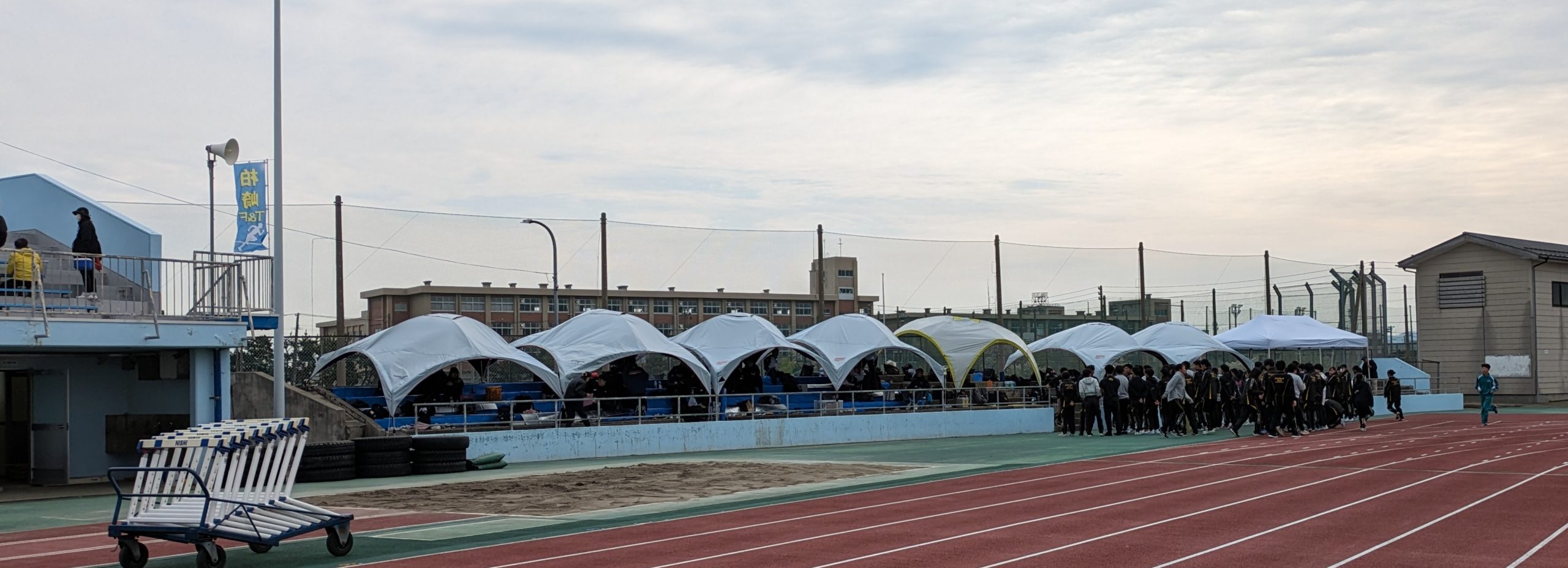2つ目は各学校が選手の控え場所として立てるテントのことです。一昔前は鉄骨で組み立てて天幕を張っていたタイプのテントでした。今でのいろいろなイベント会場で設置しているようなテントです。それが簡単に設置できるタイプになり、今ではアウトドアでも使えるようなドーム型のテントになっています。多くの学校がそのタイプを使っているため、写真のように今までの陸上大会のスタンドの雰囲気とは違った感じがしました。昨日も優れたものになり、少人数でも建てられ、進化しているのですね。